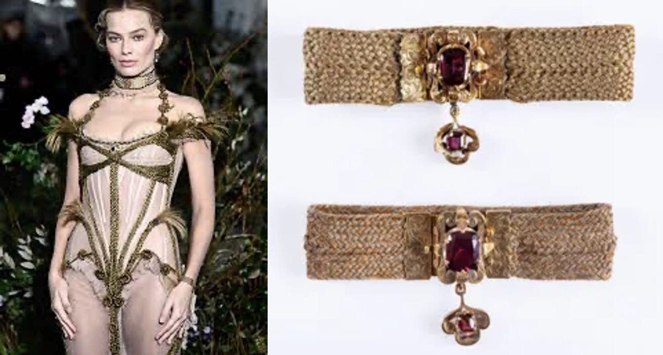 For Wuthering Heights, Robbie did it again: mixing aesthetic looks that matched the film while creating viral moments via an iconic Easter Egg. For the UK premiere, she wore a replica of “The Bracelet of Charlotte,” a mourning bracelet owned and worn by author Charlotte Brontë, sister of Emily Brontë, the author of Wuthering Heights. The internet went wild over this small accessory, speculating whether she was wearing the original (which contains strands of hair from Emily and Anne Brontë).